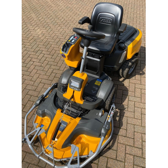 Tondeuse autoportée STIGA Park Pro 340 IX 4 roues motrices avec remorque.