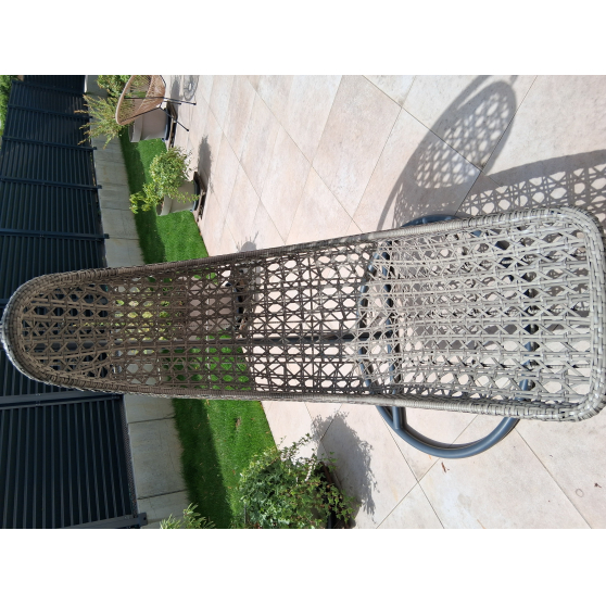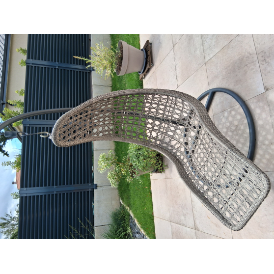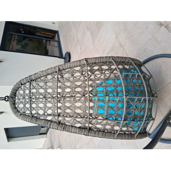 Vends transat suspendu en résine tressé couleur taupe, avec coussin bleu.
